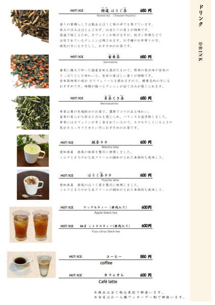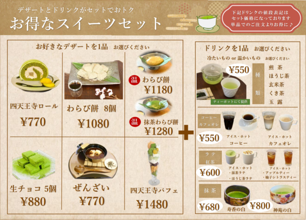 (わらび餅、四天王寺ロール、四天王寺パフェ、生わらび餅、ぜんざい、抹茶の生チョコレート、抹茶モンブラン、団子)